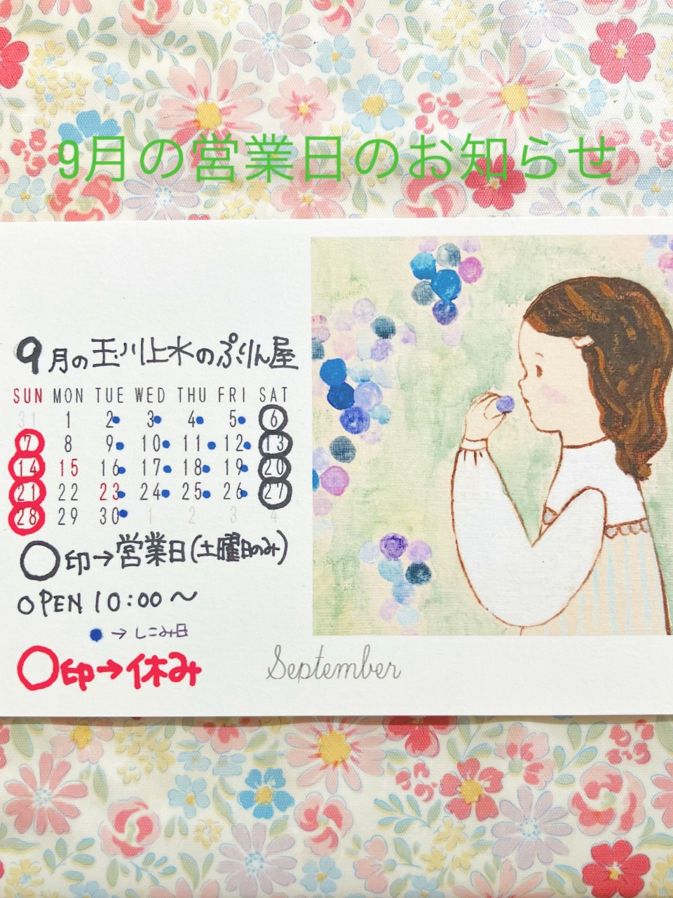 2025年9月のぷりん屋営業日お知らせ