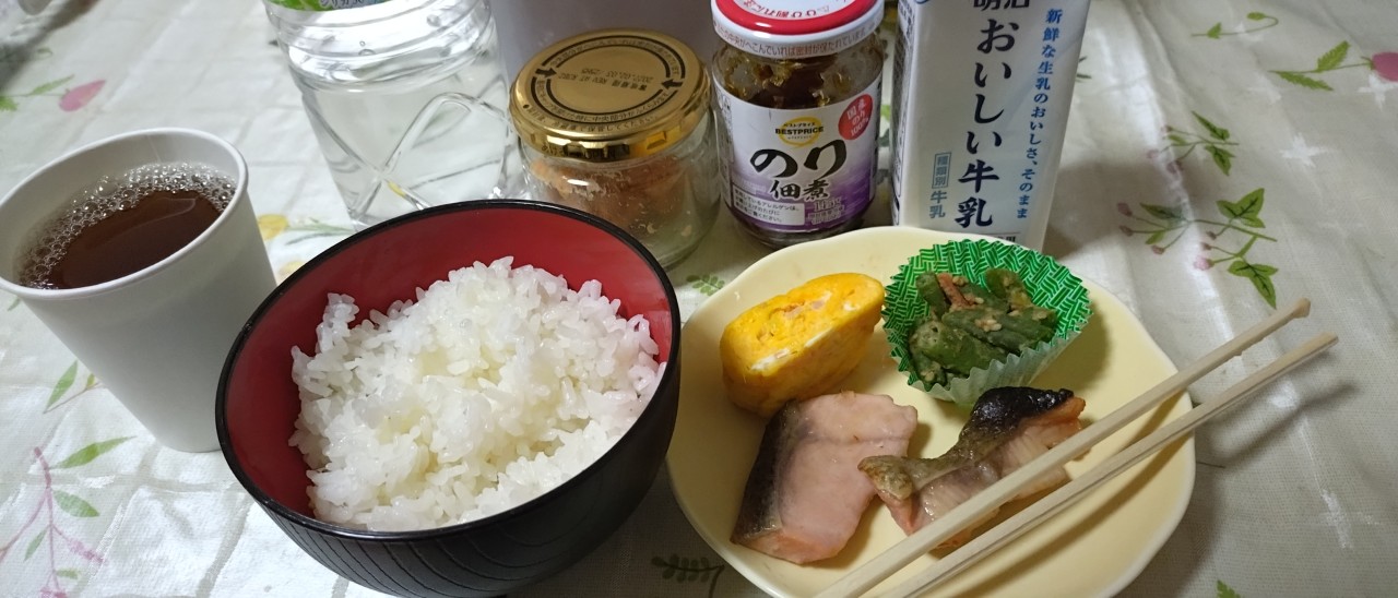 ご飯。冷食惣菜2個。玉子焼き3つ。 ウインナー1本。麦茶。 でした! 写真撮り忘れました。