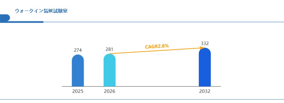 Global reports調査チームの最新レポート「グローバルウォークイン気候試験室市場規模、主要企業シェア、ランキング分析レポート【2026年版】」によると、グローバルウォークイン気候試験室市場は2025年の274百万米ドルから2032年には332百万米ドルに成長し、2026年の市場規模は約281百万米ドルと推計されており、2026-2032年のCAGR(年間成長率)が2.8%に達すると予測されている。