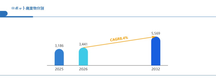 Global reports調査チームの最新レポート「グローバルロボット廃棄物分別市場規模、主要企業シェア、ランキング分析レポート【2026年版】」によると、グローバルロボット廃棄物分別市場は2025年の3186百万米ドルから2032年には5569百万米ドルに成長し、2026年の市場規模は約3441百万米ドルと推計されており、2026-2032年のCAGR(年間成長率)が8.4%に達すると予測されている。