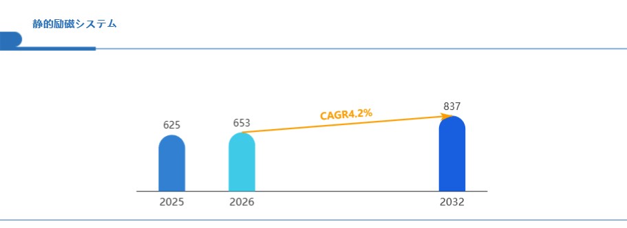 Global reports調査チームの最新レポート「グローバル静的励磁システム市場規模、主要企業シェア、ランキング分析レポート【2026年版】」によると、グローバル静的励磁システム市場は2025年の625百万米ドルから2032年には837百万米ドルに成長し、2026年の市場規模は約653百万米ドルと推計されており、2026-2032年のCAGR(年間成長率)が4.2%に達すると予測されている。