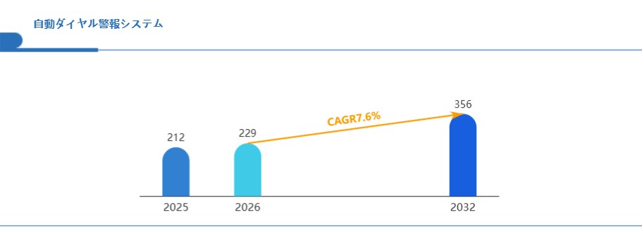 Global reports調査チームの最新レポート「グローバル自動ダイヤル警報システム市場規模、主要企業シェア、ランキング分析レポート【2026年版】」によると、グローバル自動ダイヤル警報システム市場は2025年の212百万米ドルから2032年には356百万米ドルに成長し、2026年の市場規模は約229百万米ドルと推計されており、2026-2032年のCAGR(年間成長率)が7.6%に達すると予測されている。