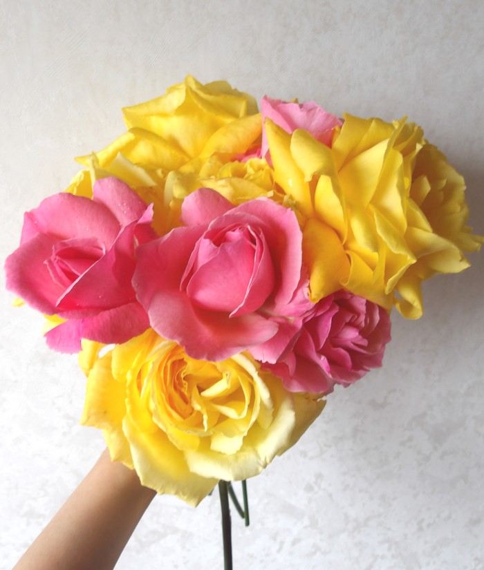 庭には3種のバラを植えています。 ピンクと黄色と白!! ピンクのはもう45年近くになる超古株。 まだまだ元気に花を付け…