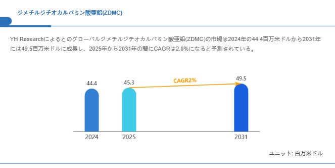 YH Researchの最新調査によると、世界のジメチルジチオカルバミン酸亜鉛(ZDMC)市場は、2024年の44.4百万米ドルから2025年には45.3百万米ドルへと拡大し、2031年には49.5百万米ドルに達すると予測されています。この間、CAGR(年平均成長率)は2%と推計されています。