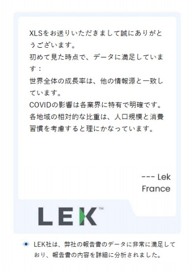 「XLSをお送りいただきして誠にありがとうございます。初めて見た時点で、データに満足しています:世界全体の成長率は、他の情報源と一致しています。COVIDの影響は各業界に特有で明確です。各地域の相対的な比重は、人口規模と消費習慣を考慮すると理になっています。」