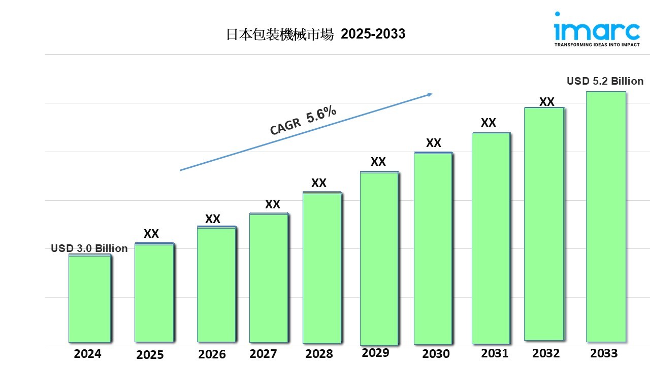 IMARCグループの最新レポートによると、日本の包装機械の市場規模は2024年に30億米ドルに達しました。今後、IMARCグループは、2025年から2033年の間に5.6%の成長率(CAGR)を示し、2033年までに市場が52億米ドルに達すると予想しています。市場は、自動化、効率的な生産への需要、持続可能な包装ソリューションの革新に牽引されて成長しています。