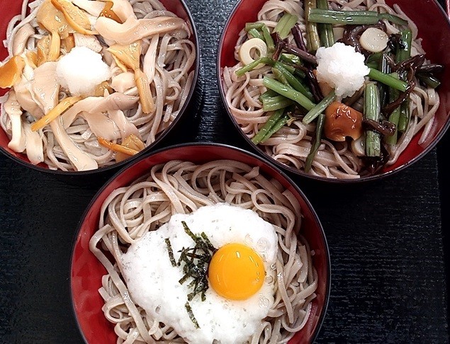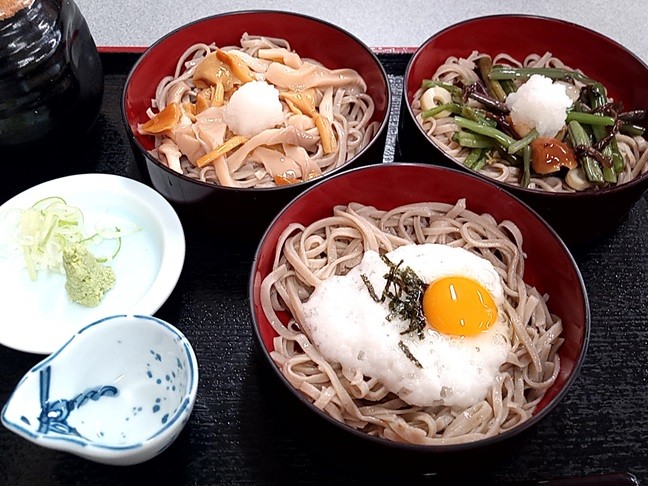 頂いたのはこれまた「そば三昧」(1300円)です。写真左上から時計回りに「きのこ」「山菜」「月見とろろ」ですね。ボリューム的には3皿合わせて、かけそば1杯ぶんってとこですね。
