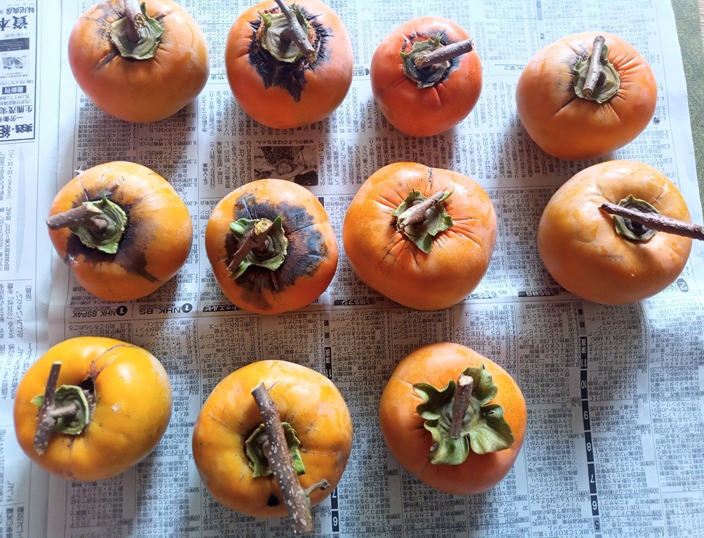 しかし今年は、赤くなり始めたと思ったら、既に熟柿です。これ10月上旬までの酷暑のなせる業なんでしょうね。そういう訳で早めに収穫し、追熟を待つ組と、干し柿にする組との「二刀流」で秋を迎えています。それに昨今は「熊対策」で早めに収穫せんならんしね。