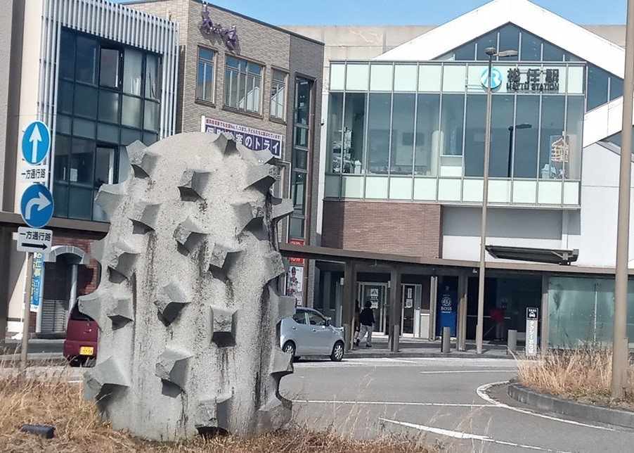 JR松任駅前の不思議な、いやイケてるオブジェ、ご存知ですか?。これ怪獣?ガラモンの背中?。松任駅前を通行するたびに気になります。