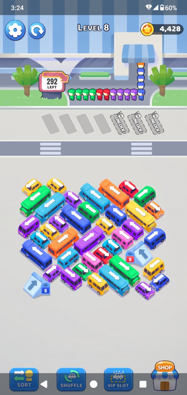 私がプレイしてるのは、スクショにある通りで4台しか駐車出来ないんですよ。で、バスは満員にならないと発車しない。つまり、並んでる人数と次にくる人の色を見て、何人乗れる車をどの順番で用意するか考える必要があるんですね。