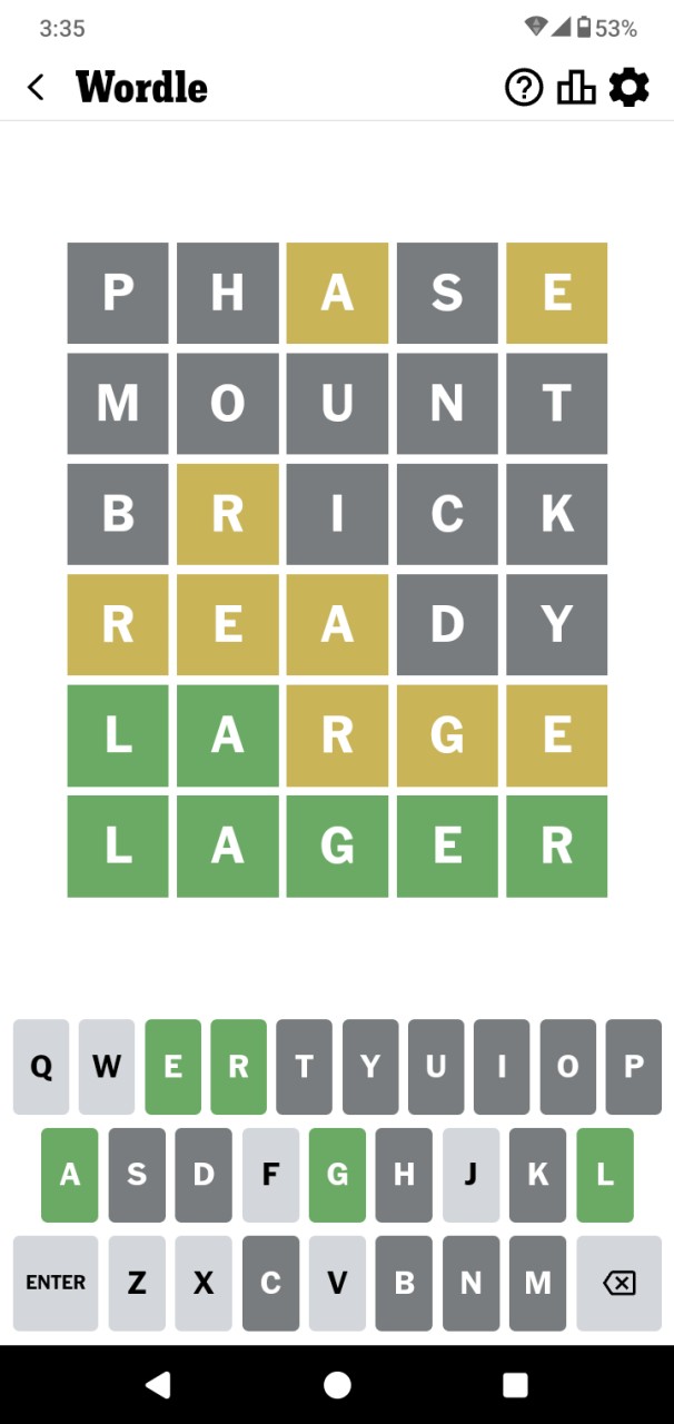グレーアウトする文字は、正解に使われていない。黄色は、使われているけれど、位置が違う。緑は文字も位置も合っている。それを頼りに、正解の単語を探るのです。
