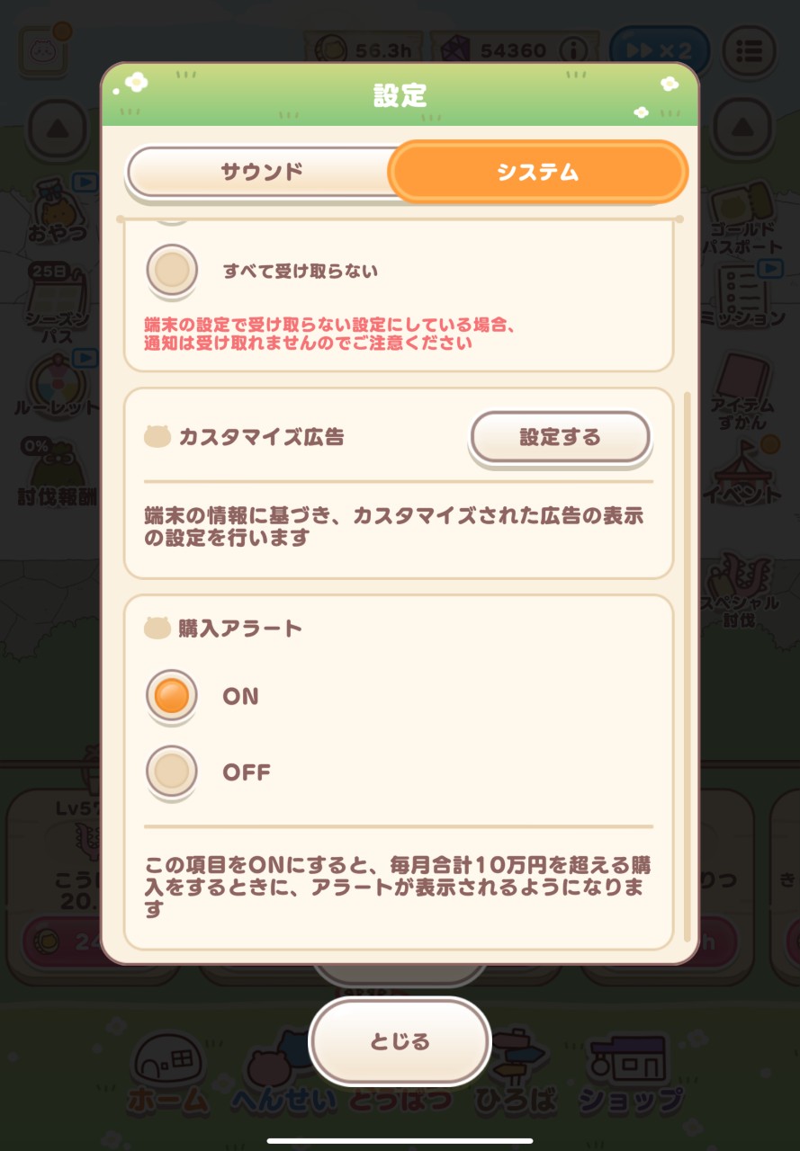 ゲームの設定画面に「購入アラート」という項目があり、月の課金額が一定を超えたらアラートが表示されるようにする…という事が可能なのですが、以下がその設定画面です。