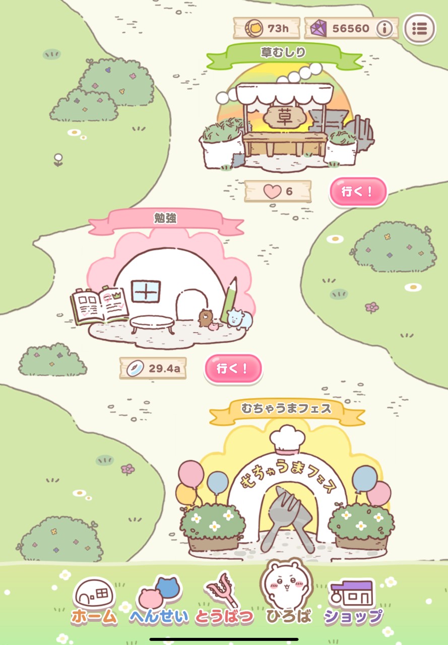 ミニゲームの『草むしり』『むちゃうまフェス』と、ステータスアップの『勉強』ができる。