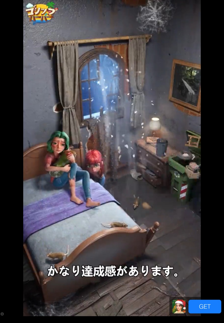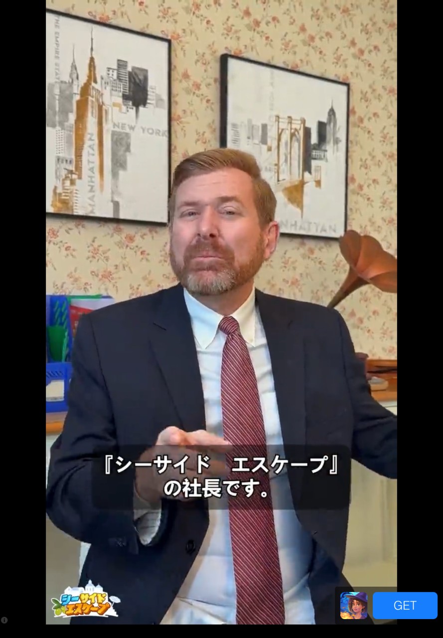 シーサイド・エスケープというゲームの広告です。この社長の演説の後に、吹雪の中で凍える母娘を助けてあげるプレイアブル広告が入りますが、そんなゲームではありません。