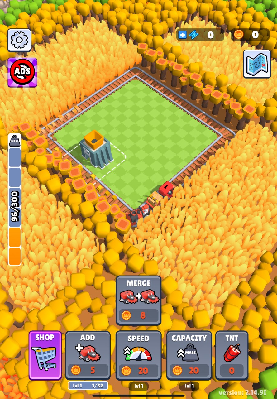 えー…何をするゲームかと言いますと、画像にあるもので全てなのですが、オーバルコース状のレールの上に列車を走らせ、その列車についたノコギリで外周の木や岩を削り、それを売って列車をアップグレードします。そして外周にある障害物が全部なくなるとクリア。…というだけの、ゲーム性もへったくれもないthe虚無です。