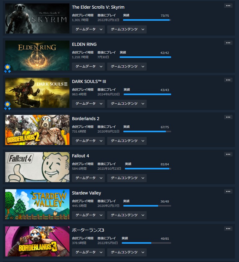 で、プレイ時間でソートした結果がこちらです↓