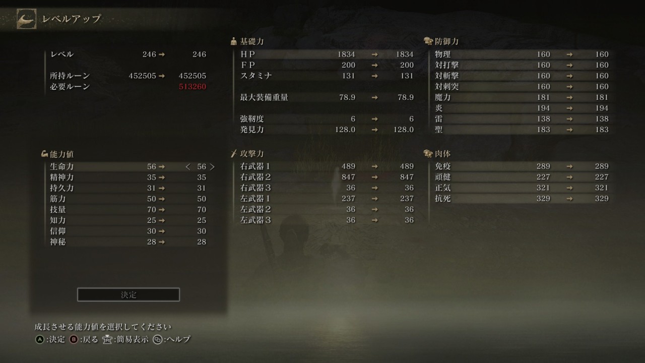 RPGなので、敵を倒して経験値をゲットして、それでレベルアップをして…というゲーム性ではあるんですが、そのレベルアップが独特です。主人公には『生命力』『精神力』『持久力』『筋力』『技量』『知力』『信仰』『神秘』という、計9つのパラメータが設定されています。