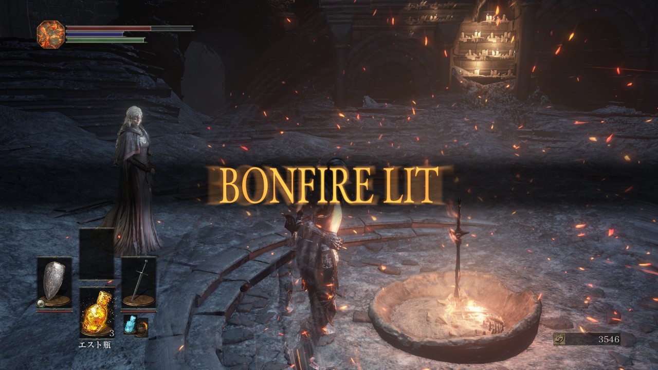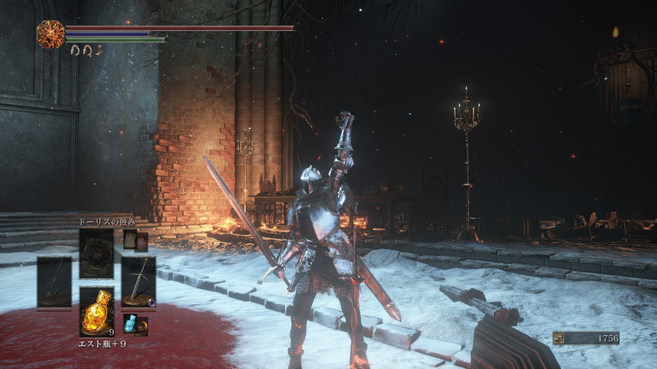 この画像はボスを倒した直後の画像なんですが、主人公の体に炎が這っているようなエフェクトが付きます。これは『火の無い灰』に『残り火』が宿った状態で、ボスを倒す、または「残り火」というアイテムの使用でこうなります。