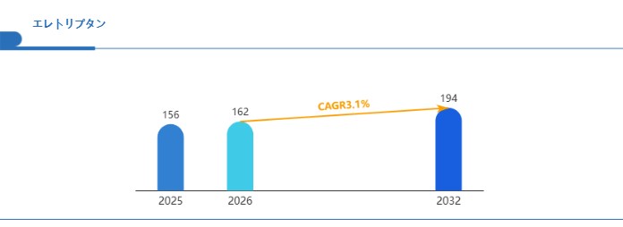 Global Reports調査チームの最新レポート「グローバルエレトリプタン市場規模、主要企業シェア、ランキング分析レポート【2026年版】」によると、2026年の162百万米ドルから2032年には194百万米ドルに成長し、2026年から2032年の間にCAGRは3.1%になると予測されています。