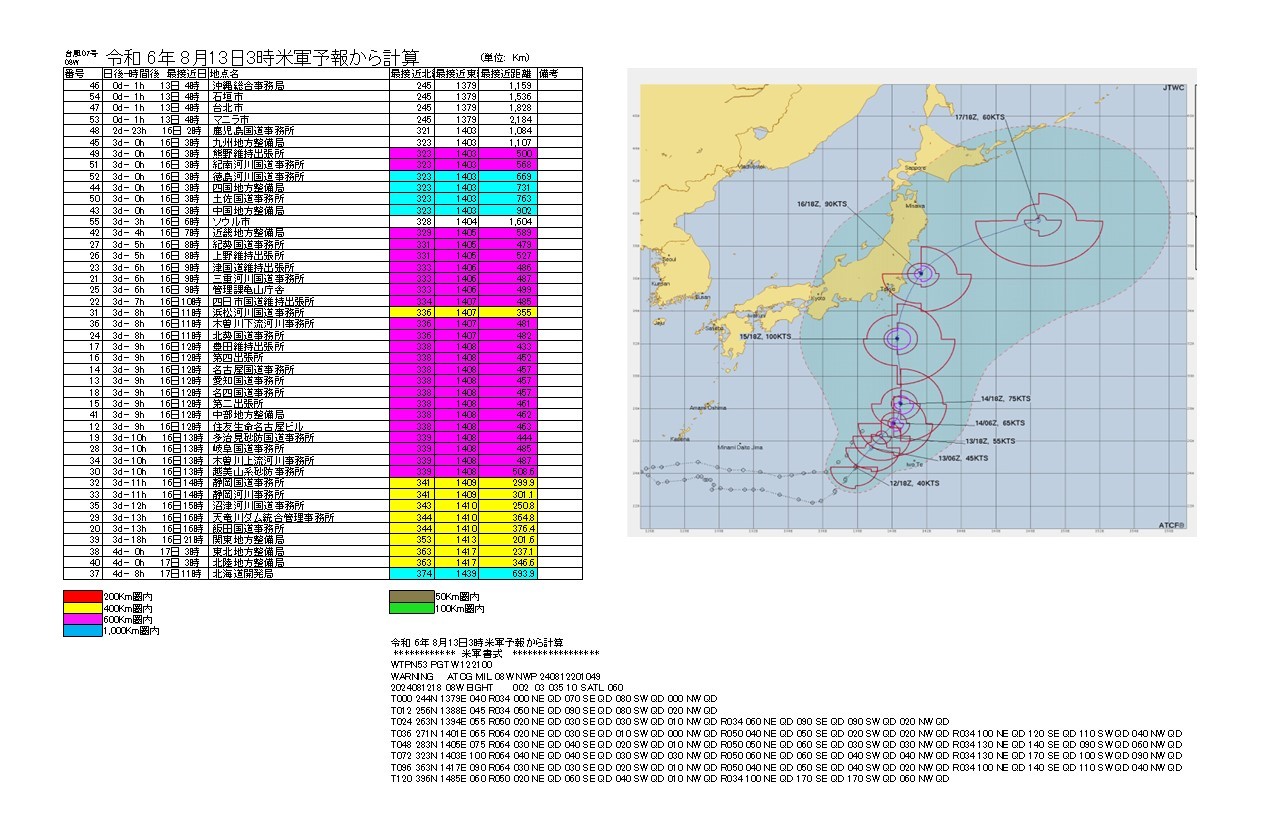 台風7号 令和 6年 8月13日3時米軍予報から計算
