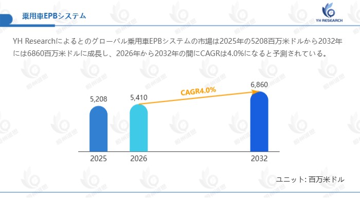 YH Researchによるとのグローバル乗用車EPBシステムの市場は2025年の5208百万米ドルから2032年には6860百万米ドルに成長し、2026年から2032年の間にCAGRは4.0%になると予測されている。
