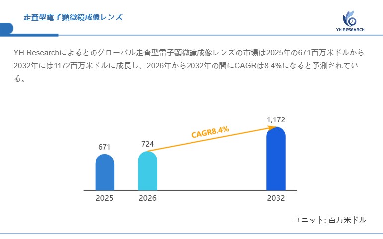 YH Researchによるとのグローバル走査型電子顕微鏡成像レンズの市場は2025年の671百万米ドルから2032年には1172百万米ドルに成長し、2026年から2032年の間にCAGRは8.4%になると予測されている。