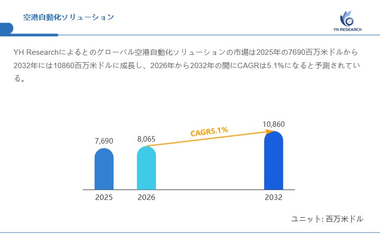 YH Researchによるとのグローバル空港自動化ソリューションの市場は2025年の7690百万米ドルから2032年には10860百万米ドルに成長し、2026年から2032年の間にCAGRは5.1%になると予測されている。