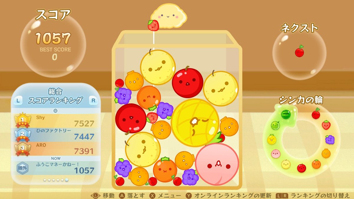 ゲーム内では、本体左のスティックもしくは上下左右の左右ボタンを使って果物を落とす位置を決めます。