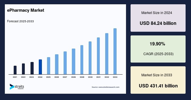 Straits Research によると、世界の ePharmacy 市場の規模は、2024 年に 842.4 億米ドルと評価されました。2033 年には 4,314.1 億米ドルに達し、予測期間 (2025 ~ 2033 年) 中に 19.9% の CAGR で成長すると予想されています。