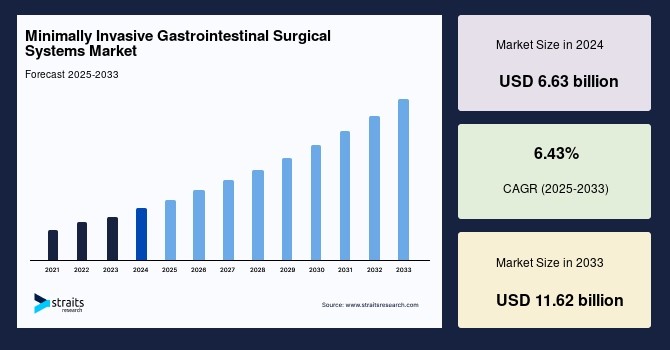 Straits Research によると、世界の低侵襲性消化器外科システム市場の規模は、2024 年に 66 億 3,000 万米ドルと評価されました。予測期間 (2025 年~ 2033 年) 中に 6.43% の CAGR で成長し、2033 年には 116 億 2,000 万米ドルに達すると予測されています。