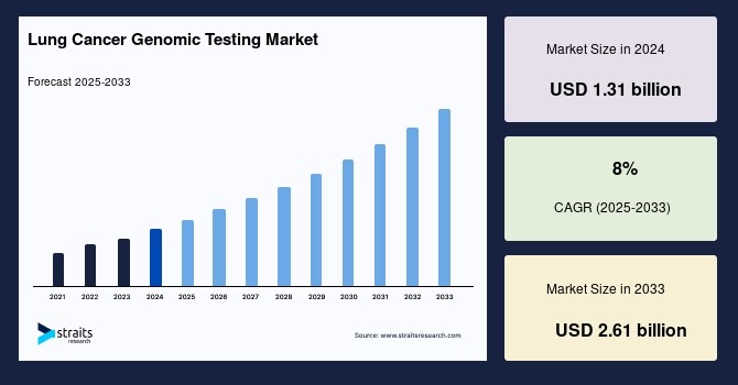 Straits Researchによると、世界の肺がんゲノム検査市場の規模は、2024年に13億1,000万米ドルと評価されました。予測期間(2025~2033年)中に8%のCAGRで成長し、2033年までに26億1,000万米ドルに達すると予想されています。