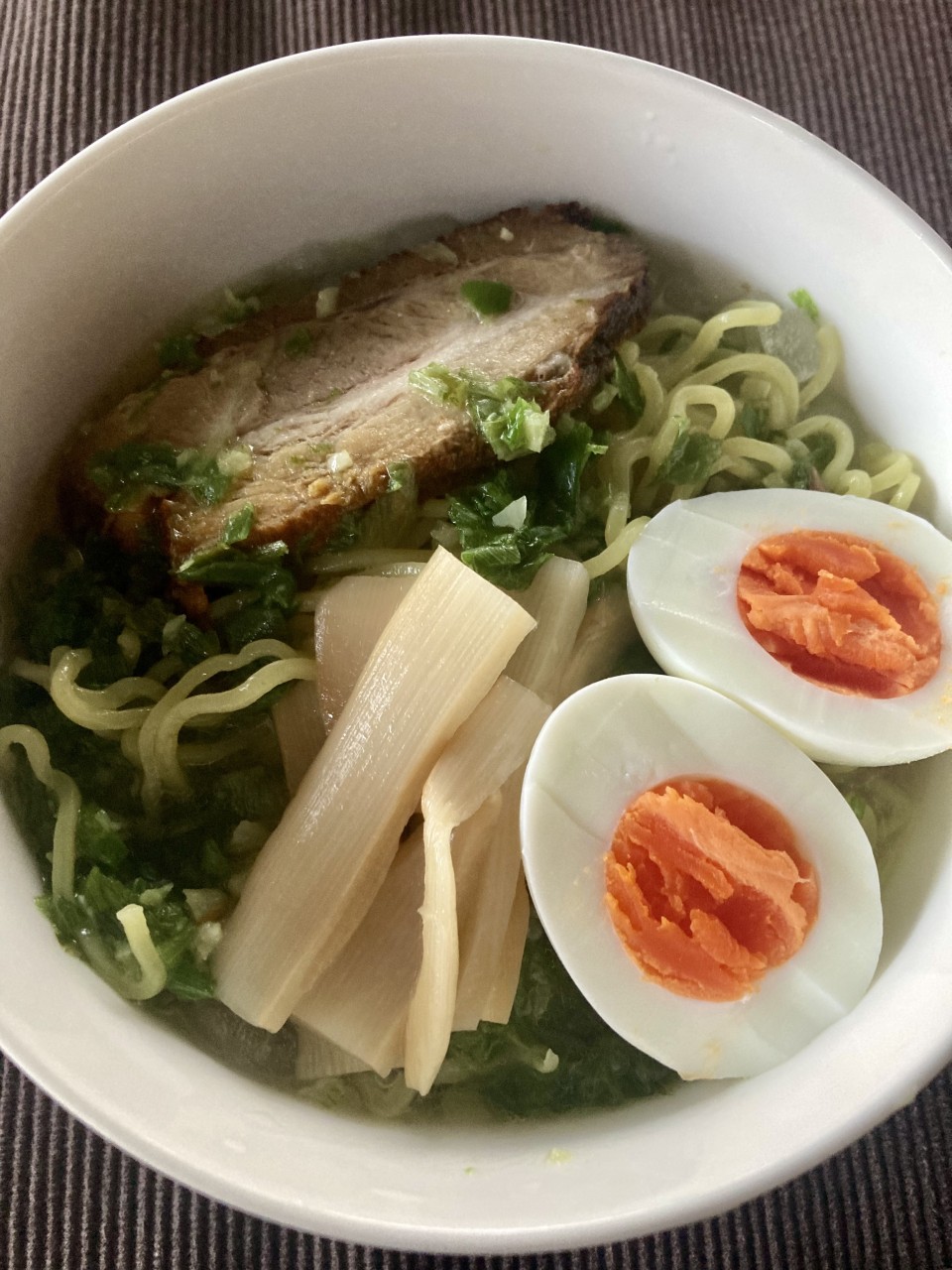 ゆで卵,チャーシュー,メンマ,海苔等をトッピング