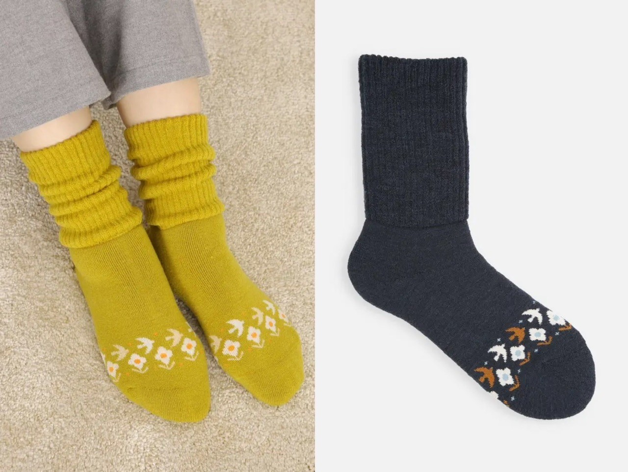 2023年秋冬に登場。つま先の小鳥と花柄がかわいいルームソックスです🥰履いた時につま先見るとなんか気分がほっこりしそうです☕️