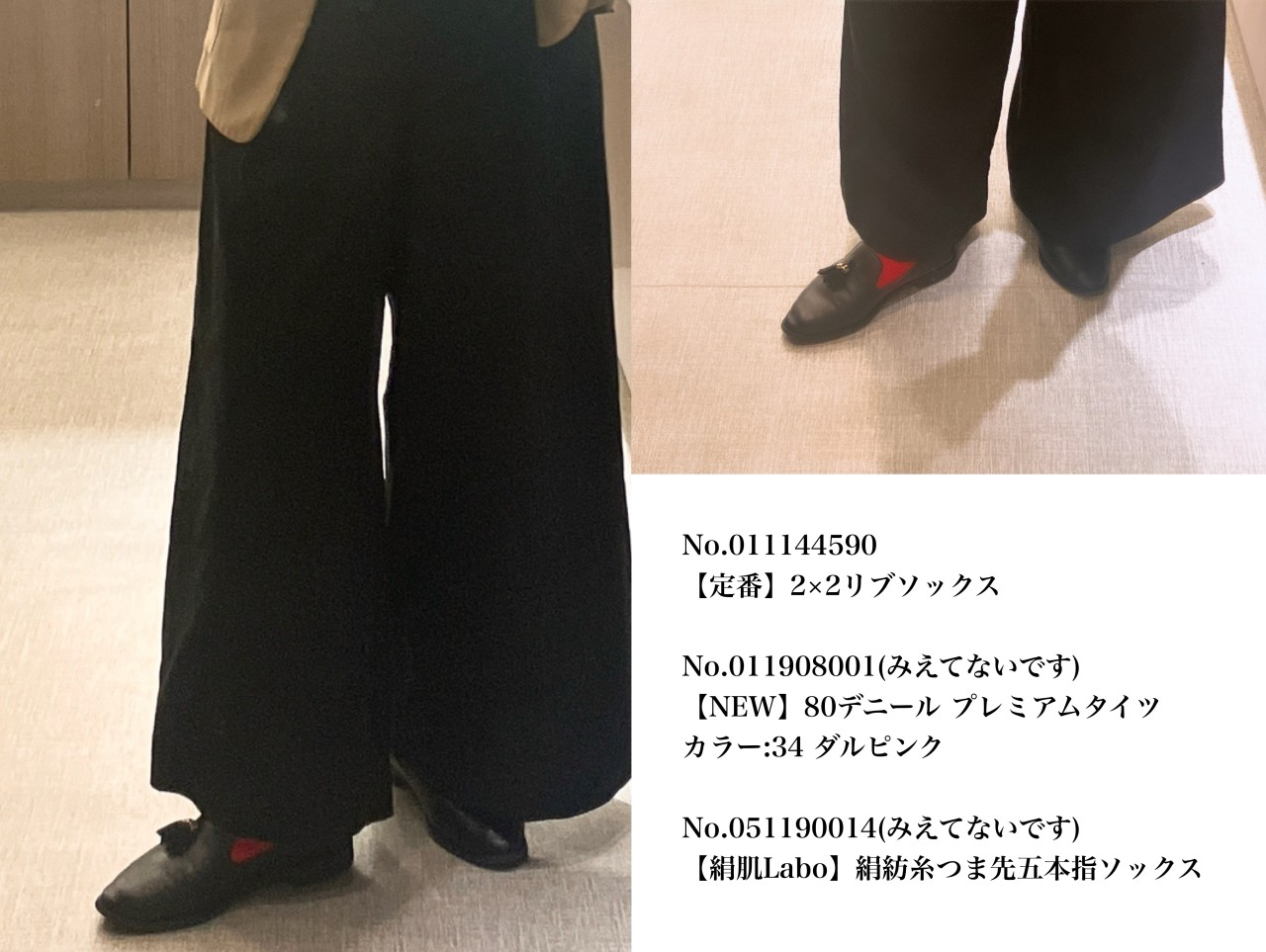 脚が2本だけ、説明する際に分かりやすくしたい、ショートソックスも履きたい…結果、ストッキング感覚で履けるハイソックスとカバー風ナイロンハイソックスを片脚ずつ重ね履きするという選択をしました