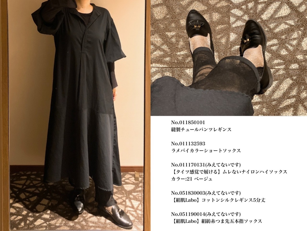 オールブラックにして組み合わせた服の異素材感を楽しみつつ、ラメソックスを合わせました