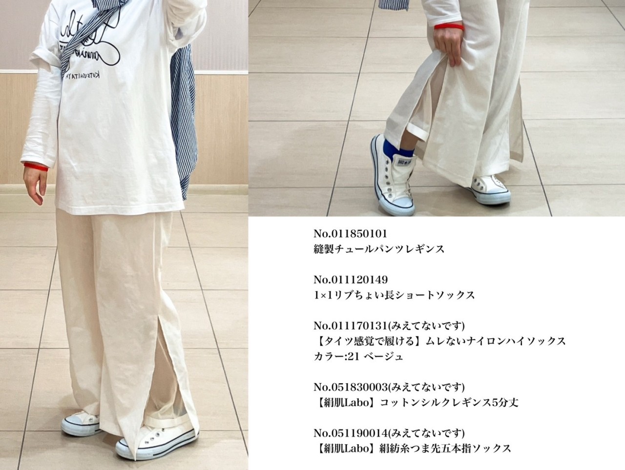 チュールパンツレギンスのオフホワイトを中心に、明るめの色を組み合わせました