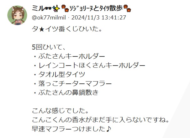 タ★イツ番くじの景品が報告される