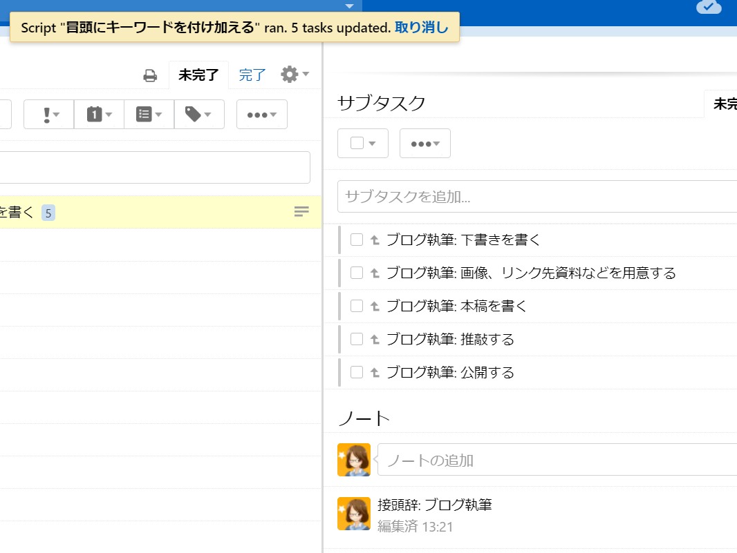 選択したタスクのサブタスクのすべてにノートで指定したキーワードを付与する。といったものです。選択したタスクのノートの1行目に『接頭辞: キーワード』などと入力されていれば、サブタスクすべての冒頭に『キーワード: ◯◯◯◯』と付与されます。