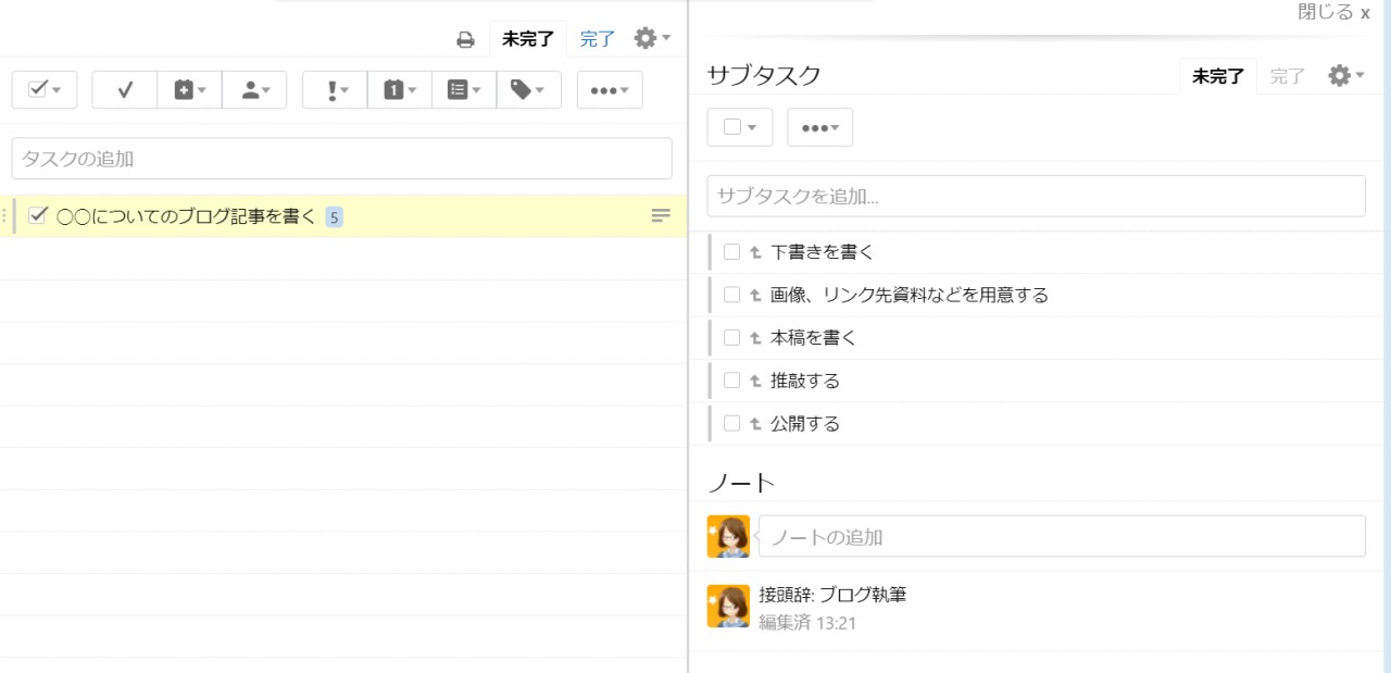 選択したタスクのノートの1行目に『接頭辞: キーワード』などと入力されていれば、サブタスクすべての冒頭に『キーワード: ◯◯◯◯』と付与されます。