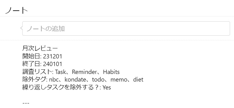 完了タスクリストを調査する期間、リスト、除外タスク、繰り返しタスクを除外するかどうかをノートの内容から判断しています。