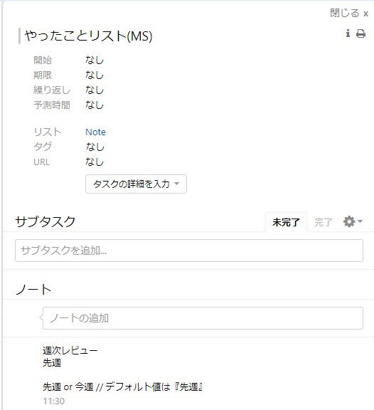 デフォルト値(先週)も設定しているので、当該タスクがなくても実行できるし、追加するノートの格納場所として使う必要もないため、タスクを新たに作る必要もないのですが、なんとなく残しています。