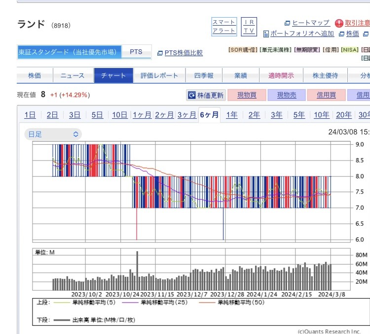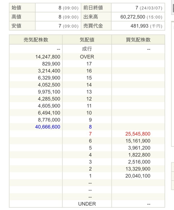試しに7円の買いの列に失礼して100株並んでみたものの、動く気配ないし場違い感半端ないのでそっと離脱した