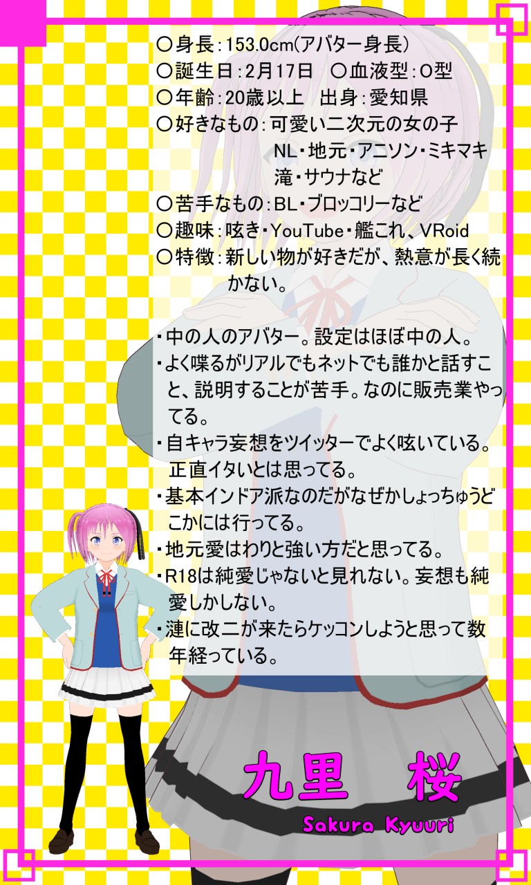 …キャラと言っていますが、私自身のアバターであり、設定も中の人である私そのものです。