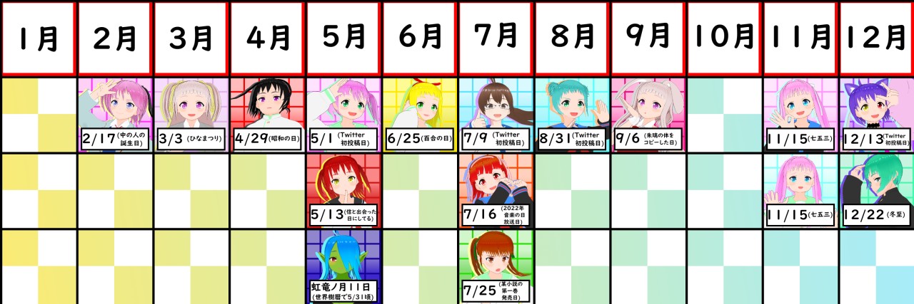 ちなみに、キャラの誕生日は全員決めていて、こんな感じです。