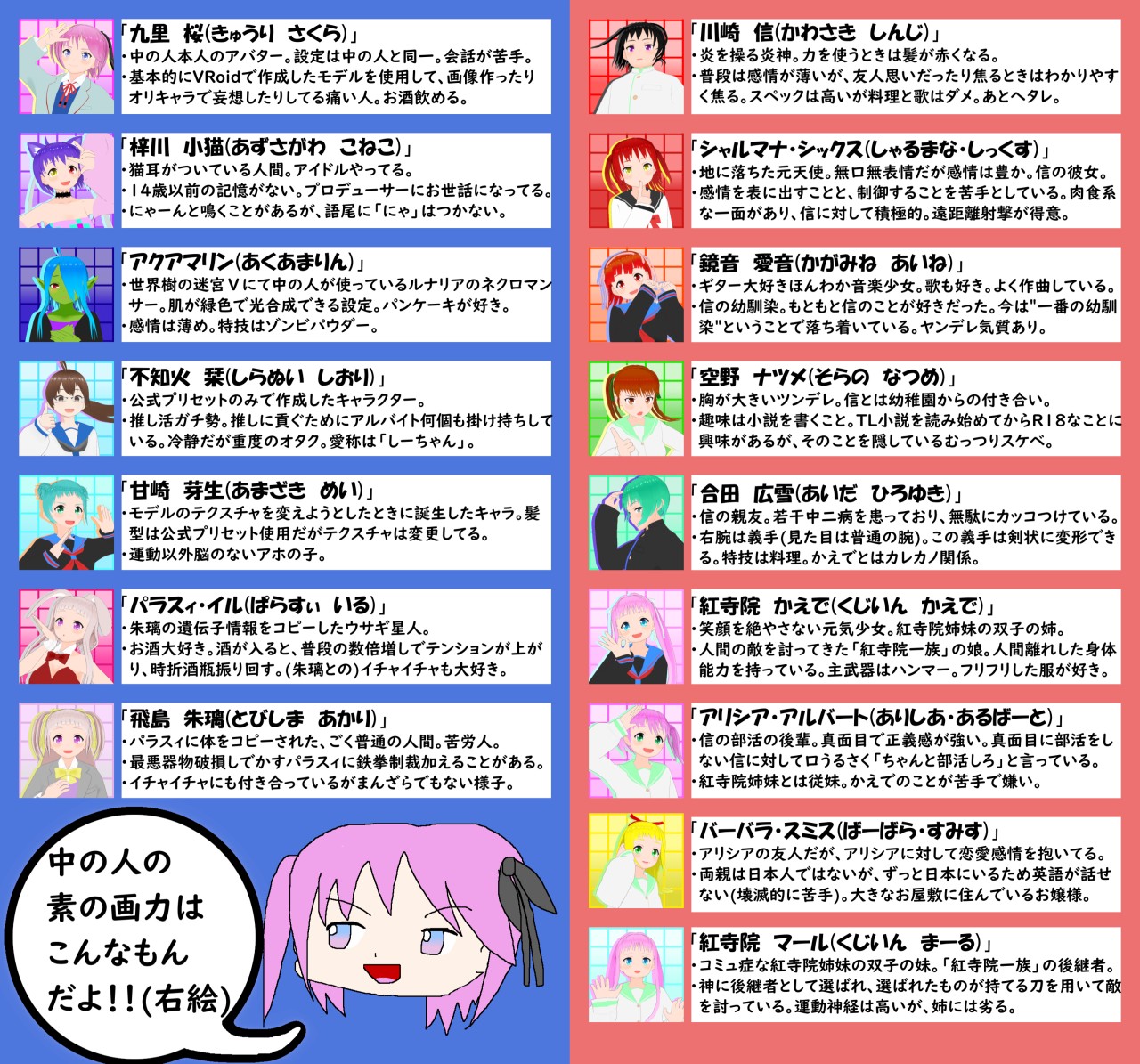 信→シャルマナ→愛音→広雪→ナツメ→(だいぶ期間空く)→アリシア(の原型)→かえで・マール(の原型)→かえで・マール→(期間空く)→アクアマリン→(VRoidモバイルやり始めたころ)→アリシア→九里→バーバラ→小猫→栞→芽生→パラスィと朱璃