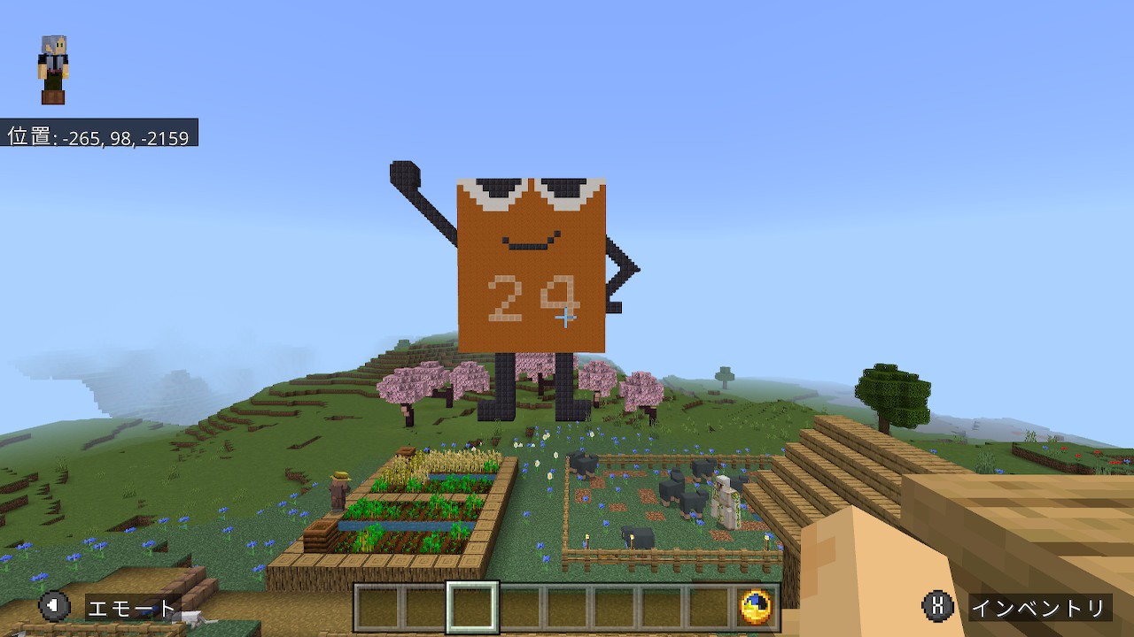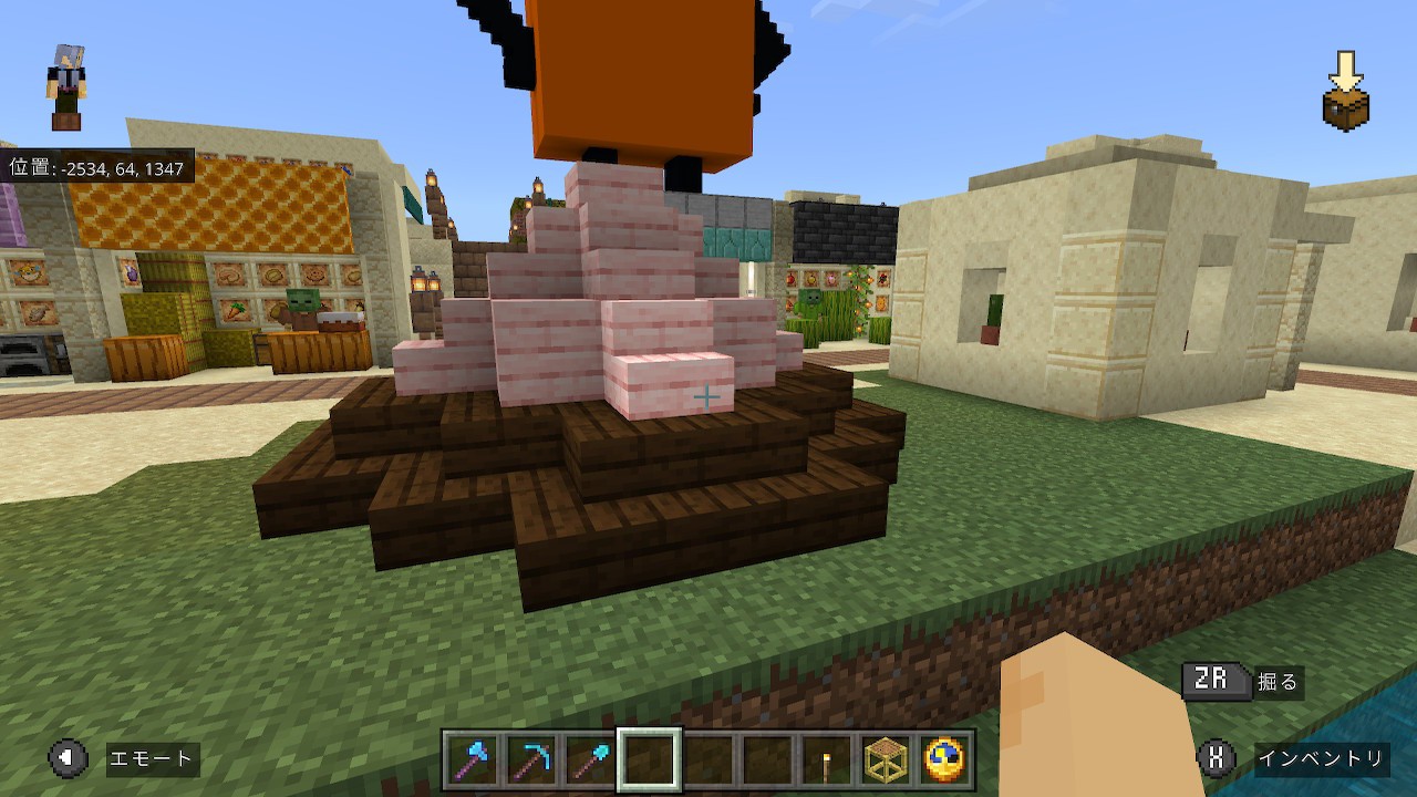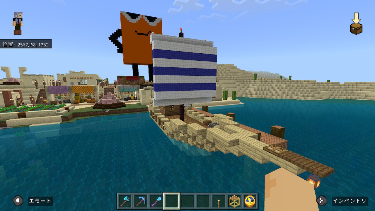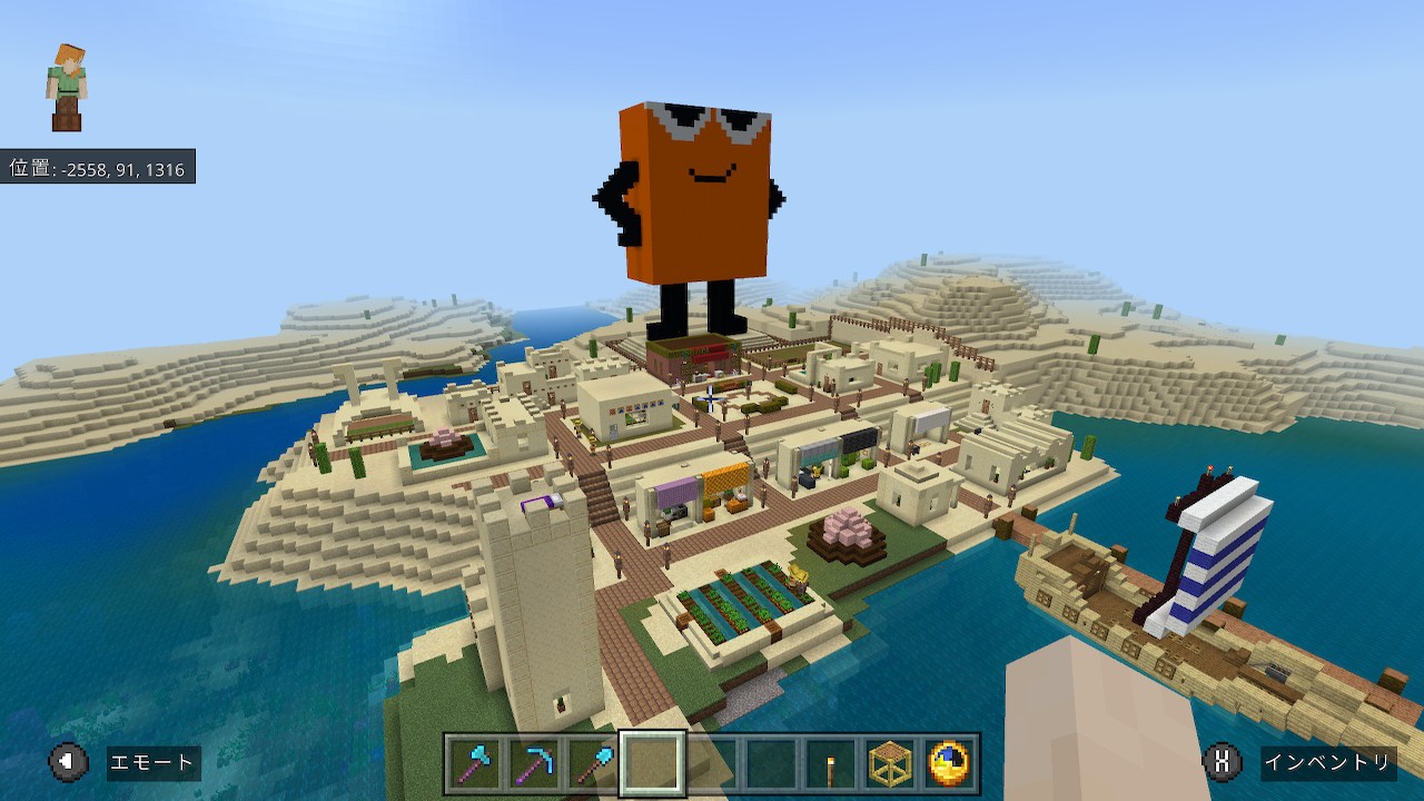 巨大ポレンジ君を村にぶっ立てて遊んでいる。喫茶ポルノを建てたりポルノ丸造船したりZombiesに店員任せたり、ポ放題にプレイ中。全景。