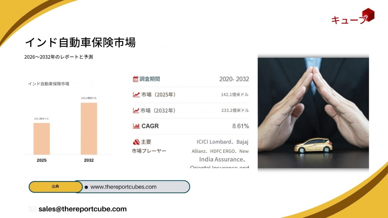 The Report Cubeのインド自動車保険市場調査レポート(2026~2032年)によると、市場規模は2025年に142億1000万米ドルに達すると推定されています。現在の業界構造と観察された需要パターンに基づくと、市場は2032年までに233億2000万米ドルに達し、年平均成長率(CAGR)8.61%で拡大すると予測されています。2026年から2032年の予測期間中、