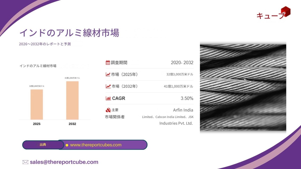 The Report Cubeの「インドアルミニウム線材市場調査レポート(2026~2032年)」によると、市場規模は2025年に32億3000万米ドルに達すると推定されています。現在の業界構造と需要パターンに基づくと、市場は2032年までに41億1000万米ドルに達し、年平均成長率(CAGR)3.50%で拡大すると予測されています。予測期間2026~2032年