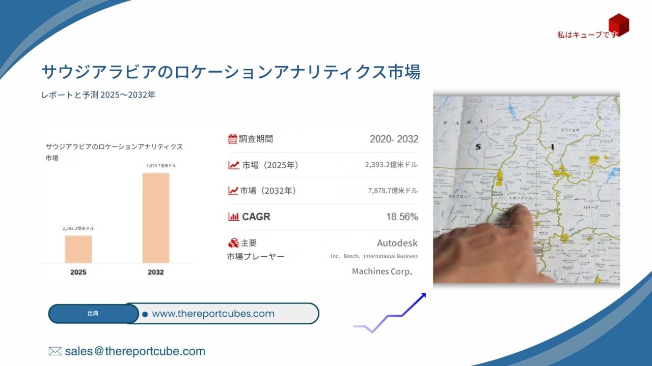 サウジアラビアのロケーションアナリティクス市場は、 2025年に約2,393.2億米ドルの価値に達し、2025年から2032年にかけて年平均成長率18.56%で成長し、2032年までに約7,878.7億米ドルに達すると予測されています。急速なデジタル変革、サウジビジョン2030に基づくスマートシティイニシアチブ、AIを活用した地理空間インテリジェンスの採用増加により、王国全体で市場の力強い拡大が推進されています。