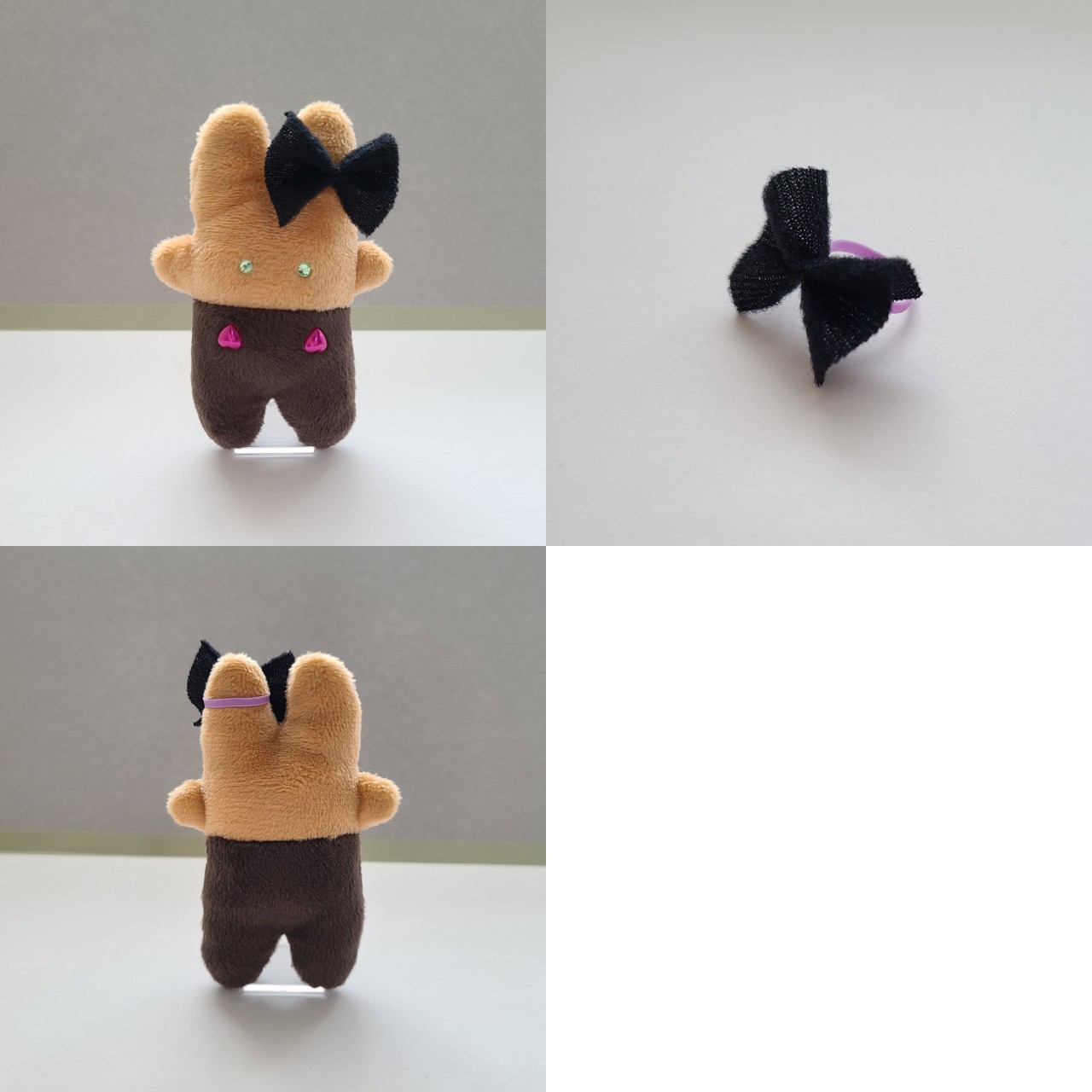 トリコット生地のリボンをポリウレタンのゴムにつけた簡易お飾りです。耳っぽいところにつけて遊べます。黒いリボンにカラフルなゴムの組み合わせになっています。